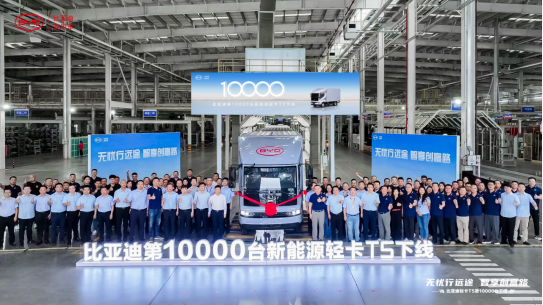9月3日,“无忧行远途,智享创富路——比亚迪第10000台新能源轻卡T5下线仪式”在淮安比亚迪卡车智慧工厂举行。比亚迪轻卡T5自推出以来,凭借其领先三电技术、可靠品质和精准城配场景适应,迅速赢得快递、快运、商超配送、冷链运输等各领域客户的青睐。