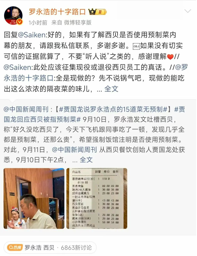 现做菜吃出预制味?西贝开放后厨自证,罗永浩悬赏10万“硬刚”!