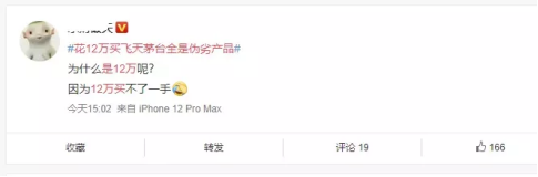 图片:截取自微博 而之所以这么多人铤而走险去造假茅台,原因就在于其中的利润巨大。一瓶假茅台的成本数百元,而售价可高达2000至3000元,是数倍的利润。因此,有网友评论:“收购、制假、贩卖,从来都是一条龙的,暴利行业概莫能外!” 还有网友调侃:“为什么花12万买到假冒茅台,那是因为12万买不了一手茅台股票。” 图片:截取自微博事实上,造假茅台早已成为产业链,不少人就在网上公开收购喝完之后剩下的空茅台酒瓶。