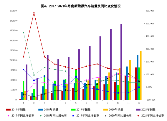 二、10月新能源汽车销量同比增长1.3倍 10月,新能源汽车产销分别完成39.7万辆和38.3万辆,同比均增长1.3倍,市场渗透率为16.4%。分车型看,纯电动汽车产销分别完成32.9万辆和31.6万辆,同比均增长1.3倍;插电式混合动力汽车产销均完成6.8万辆,同比分别增长1.7倍和1.5倍;燃料电池汽车产销分别完成59辆和47辆,同比分别下降23.4%和40.5%。 1-10月,新能源汽车产销分别完成256.6万辆和254.2万辆,同比均增长1.8倍,市场渗透率为12.1%。分车型看,纯电动汽车产销分别完成213.2万辆和210.5万辆,同比均增长1.9倍;插电式混合动力汽车产销分别完成43.3万辆和43.7万辆,同比分别增长1.2倍和1.4倍;燃料电池汽车产销分别完成940辆和953辆,同比分别增长45.3%和44.8%。