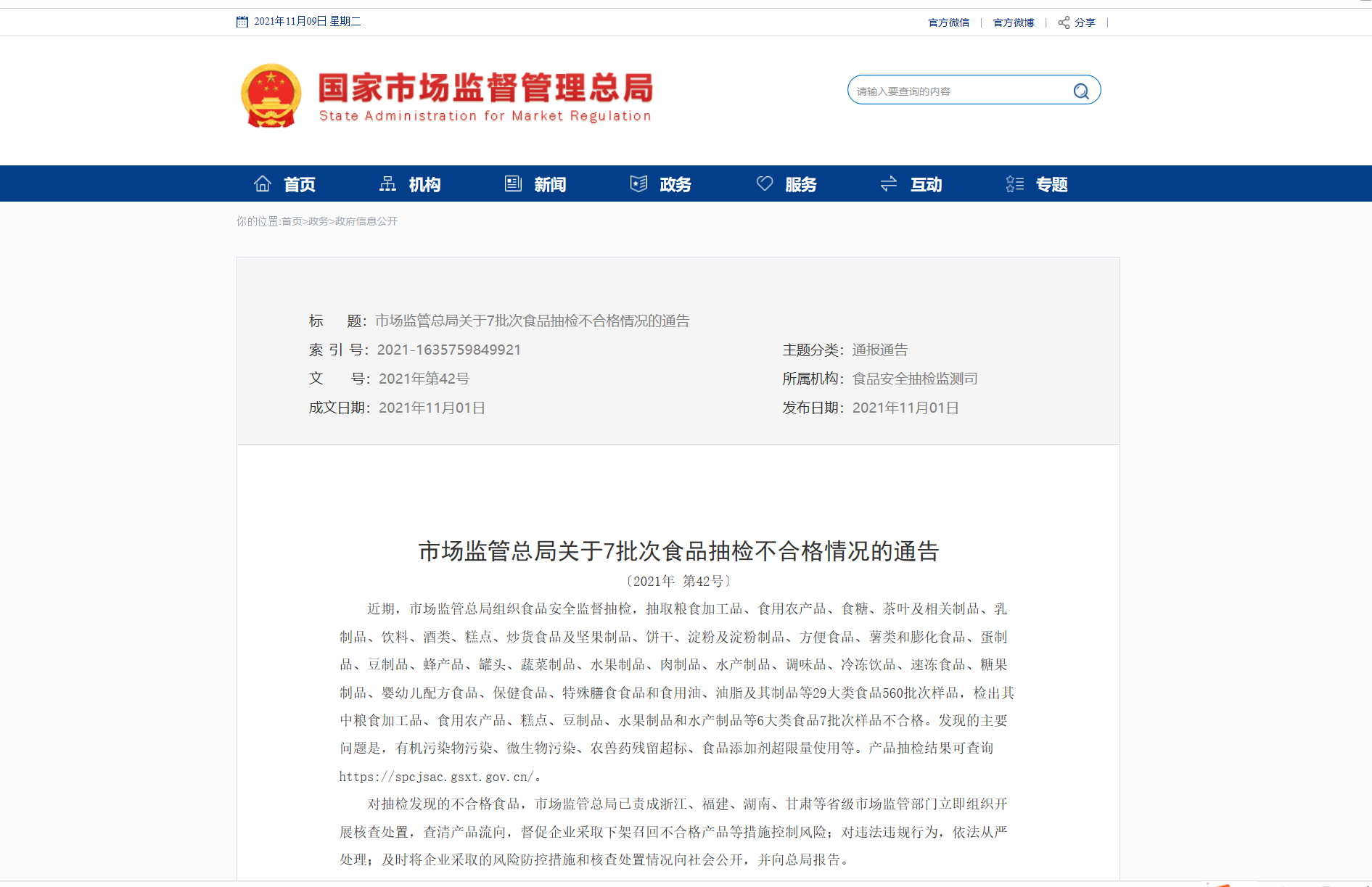 市场监管总局公布7批次抽检不合格食品 天猫独占5批