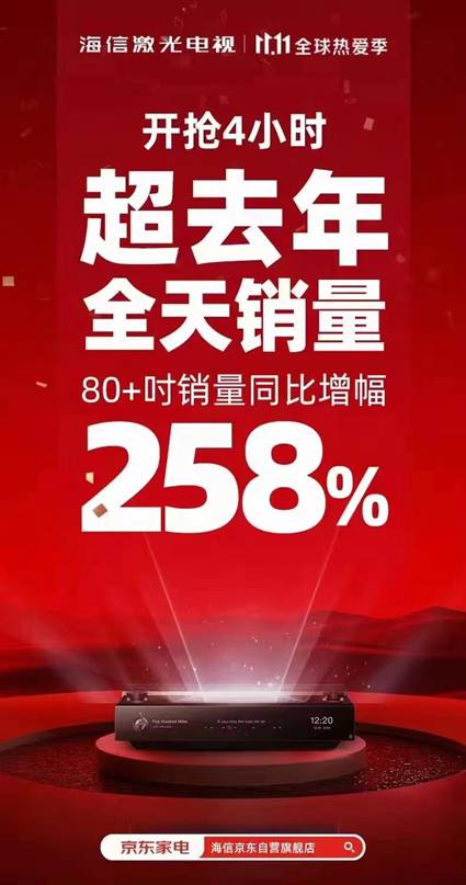双11开场55秒破亿,激光电视在京东开闸销售4小时即超去年双11全天,热销产品榜单前十几乎全部被500L以上的大容积冰箱、65英寸以上的大屏彩电“霸占”。今年双11,海信家电产品呈现出越是高端高品质越是受宠的现象。据介绍,今年双11宠粉狂欢节,海信继续坚持 “同款同价同玩法,同时同步同力度”的玩法,线上线下一盘棋,实现了一年一度双11大促开门红。 以今年提前开战的京东平台为例,10日当晚8时,尾款开付之后,海信3款75英寸、1款85英寸超大屏电视以及容声离子净味冰箱和海信变频对开门冰箱等产品迅速冲进海信热销榜单。据统计,进入海信热销榜单的电视产品全部在65英寸以上,75英寸及以上超大屏电视在热销前十榜单中占据了4款,成为绝对主角,创造了新的记录。 与此同时,以激光电视、游戏电视、真空冰箱为代表的高端产品,也备受消费者追捧。在京东平台黄金尺寸激光平板电视排行榜前十中,海信激光电视独占6名,上演“霸榜”,且多款激光电视产品已被抢购一空,一些地区出现断货。据介绍,今年以来,激光电视在线上销量持续增长,初步统计,今年双11,海信激光电视80英寸+销量在京东平台同比增幅258%。 |