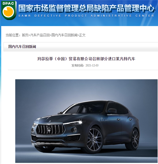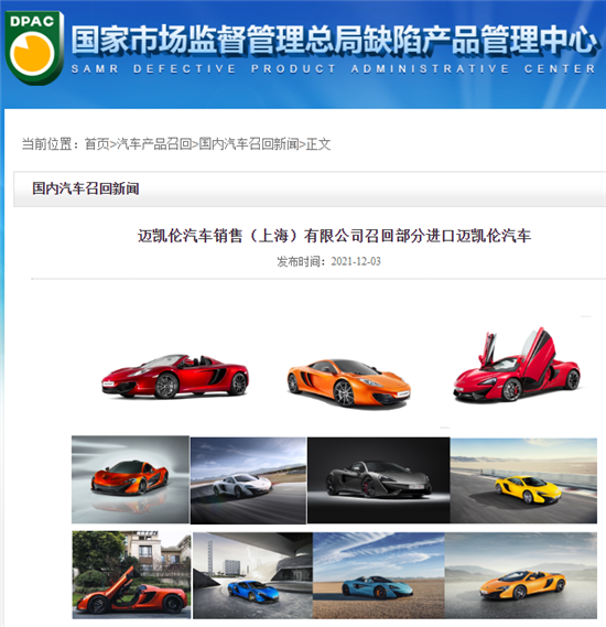 中国经济网12月3日讯(记者 姜智文) 今日,国家市场监督管理总局缺陷产品管理中心发布公告称,迈凯伦汽车销售(上海)有限公司与玛莎拉蒂(中国)汽车贸易有限公司,计划召回758辆进口车,其中迈凯伦740辆,2021款莱凡特(Levante)18辆。