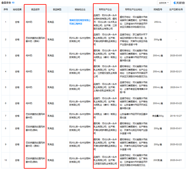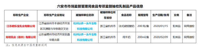 图片来源:《牧同科技股份有限公司2020年度报告》 “奶源问题”在市场监督部门的抽检信息也佐证了这一点。 根据六安市市场监督管理局2020年3月的食品专项监督抽检中发现,纯牛奶由光明乳业(德州)有限公司生产,认养一头牛的法式碳焙酸奶由江苏君乐宝乳业有限公司生产。