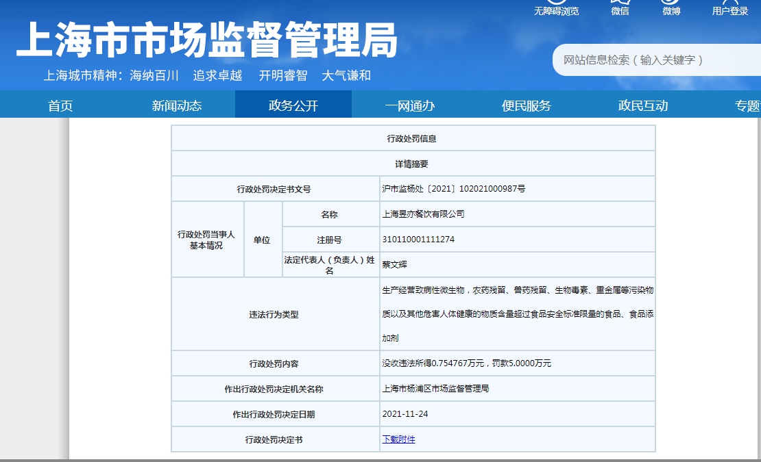 来源:上海市市场监管管理局网站截图 行政处罚决定书显示,2021年8月20日,上海市杨浦区市场监督管理局依法对上海昱亦餐饮有限公司经营的“牛蛙”食品进行抽样并委托委托谱尼测试集团上海有限公司进行检验。经谱尼测试集团上海有限公司检验并出具《检验报告》,该牛蛙食品的恩诺沙星(以恩诺沙星与环丙沙星之合计)项目不符合GB31650-2019《食品安全国家标准 食品中兽药最大残留限量》要求,检验结论为不合格。当事人对检验结论有异议,于2021年9月15日提出复检申请,经上海市食品药品检验研究院复检并出具的《检验报告》,该牛蛙食品检验结论为不合格。当事人对复议结论无异议。当事人的上述行为涉嫌违反了《中华人民共和国食品安全法》第三十四条第(二)项的规定,上海市杨浦区市场监督管理局根据《市场监督管理行政处罚程序规定》第十八条第一款和第十九条的规定于2021年9月14日立案调查。 经查明,上述食品为当事人于2021年8月19日向上海乃正贸易有限公司采购,共60kg。2021年8月20日当天当事人对上述食品加工后以菜品“牛蛙煲”对外销售,标示销售价格为158 元/份,共对外销售51份,重量计57.6kg,实际销售金额计7547.67元。当事人的上述食品货值金额为8058元,违法所得为7547.67元。案发后当事人未再经营上述不符合食品安全标准的食品。 行政处罚决定书显示,上海昱亦餐饮有限公司经营不符合食品安全标准的食品的行为违反了《中华人民共和国食品安全法》第三十四条第(二)项“禁止生产经营下列食品、食品添加剂、食品相关产品:(二)致病性微生物,农药残留、兽药残留、生物毒素、重金属等污染物质以及其他危害人体健康的物质含量超过食品安全标准限量的食品、食品添加剂、食品相关产品”的规定。 上海市杨浦区市场监督管理局于2021年11月24日决定责令当事人改正违法行为,并作行政处罚如下:一、没收违法所得人民币柒仟伍佰肆拾柒元陆角柒分;二、罚款人民币伍万元整。 天眼查APP显示,上海昱亦餐饮有限公司成立于2020年,注册资本50万元人民币,大股东为嘉兴盐美餐饮管理有限公司,后者系胖哥俩品牌关联公司之一——嘉兴盐商餐饮管理有限公司全资子公司。 今年以来,胖哥俩多次因食品安全问题被罚。据媒体报道,11月23日,大股东同为嘉兴盐美餐饮管理有限公司的北京杭帮味美餐饮有限公司(胖哥俩肉蟹煲北京上地华联店)也曾因牛蛙兽药残留量超标,被北京市海淀区市场监管局罚款5000元,并没收违法所得2590.73元。 11月10日,胖哥俩肉蟹煲北京北辰店曾因“每份海蟹的重量均与宣传内容存在明显差距”,被北京市朝阳区市场监管局罚款39.9万。 8月,北京胖哥俩肉蟹煲曾被曝使用过期食材和隔夜死蟹,10月,被北京市丰台区市场监管局罚款50万元。(中新经纬APP) |