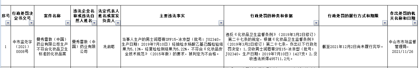 据一份公开日期为11月26日的行政处罚决定书显示,经抽检,曼秀雷敦(中国)药业有限公司生产的男士润唇膏SPF15-冰凉型(批号:J02340,生产日期:2019年7月10日)水杨酸乙基己酯检验结果为5.13%,复检检测结果为5.22%,不符合《化妆品安全技术规范》的要求,被判定为不合格产品。 中山市市场监督管理局认为,曼秀雷敦(中国)药业有限公司违反了《化妆品卫生监督条例》第二十七条的规定,根据《化妆品卫生监督条例》第二十七条,决定没收该企业男士润唇膏SPE15-冰凉型(批号:J02340,生产日期:2019年7月10日)1427支,并没收其违法所得495711.2元。