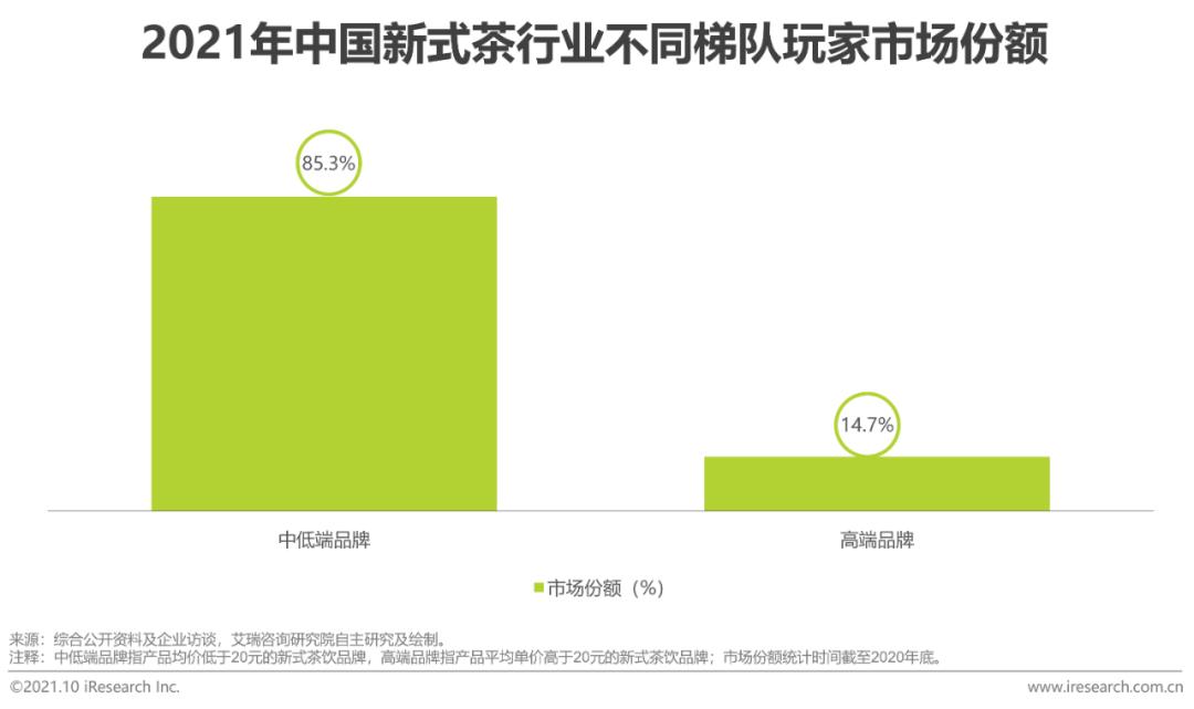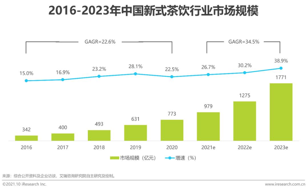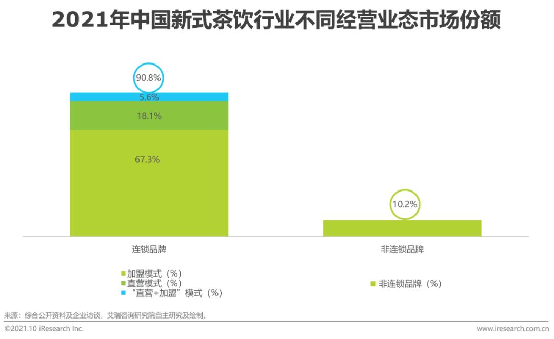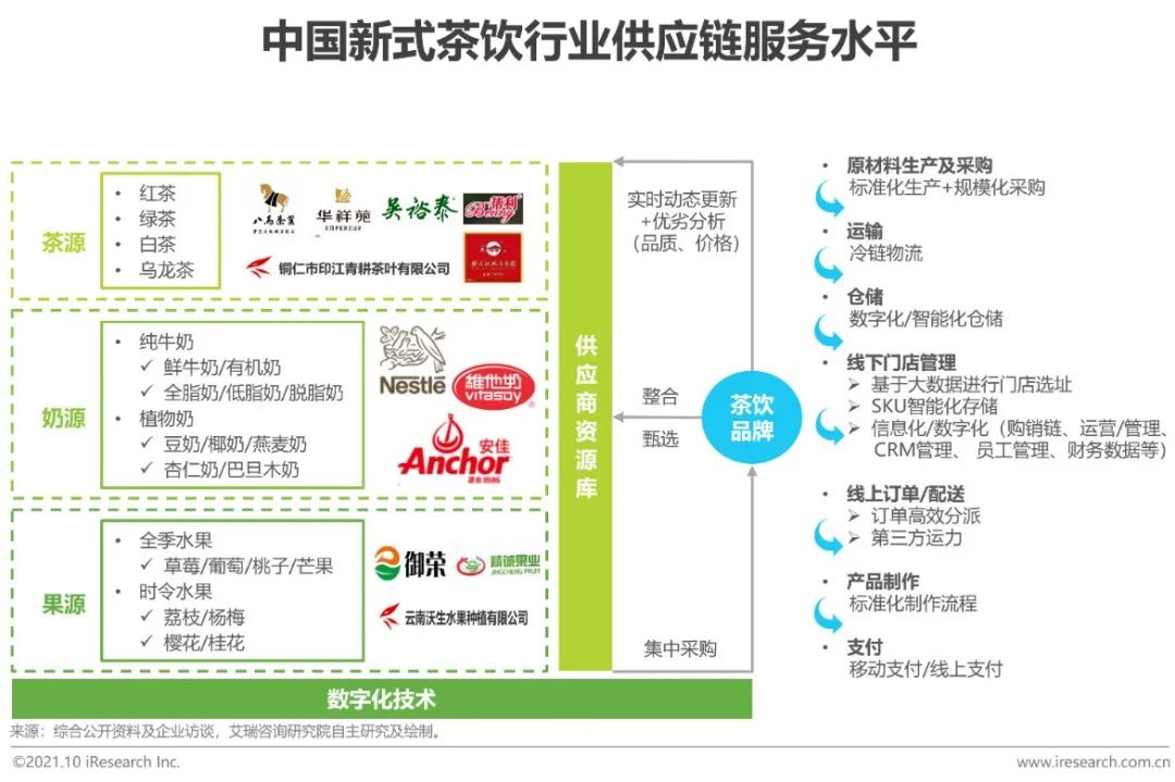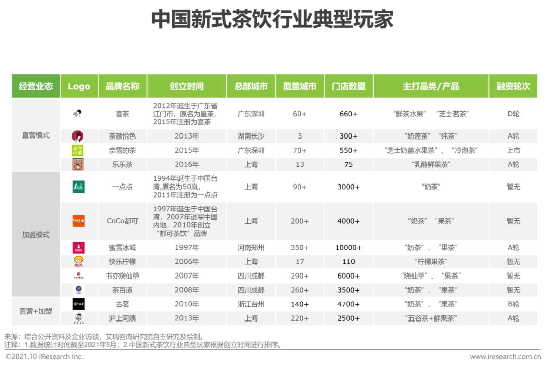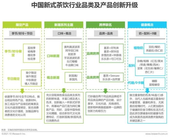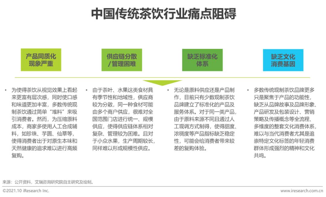 新式茶饮丨研究报告 核心摘要: 概念界定:新式茶饮指在传统现制茶饮的基础上进行产品改良及创新的新式现制茶饮,通常使用原茶、鲜奶、鲜果等新鲜/优质的原辅食材,并将其进行多样化搭配及融合,且定期推出差异化新品。品牌营销模式注重“线上+线下”、“体验+社交”。 驱动因素:从国家宏观经济环境来看,居民消费升级、消费互联网化、新消费相关政策等均利好新式茶饮行业;从同样具备成瘾性的现制饮品茶饮和咖饮的对比来看,茶饮品类更受中国消费者青睐;新式茶饮能够充分解决传统现制茶饮的众多痛点,满足现代消费者的消费升级需求。 市场规模:2020年,中国新式茶饮行业市场规模为772.9亿元人民币,且呈快速增长趋势,艾瑞预计,到2030年,整体市场规模将接近2千亿元人民币。由此可见,中国新式茶饮行业仍存在较大市场空间和发展潜力。 竞争格局:1.南方市场的品牌及门店数量相较北方市场和中西部市场更多;2.连锁加盟模式为主要经营业态;3.高端品牌、中腰部品牌、下沉品牌百花齐放;4.中低端连锁品牌集中度相对较高;5.原料食材为主要成本构成;6.全国型和地方型玩家优劣互补。 发展趋势:1.通过打造主题概念、联名概念和健康概念以及布局咖啡赛道进行品类及产品创新升级;通过供应链整合以及数字化赋能系统提升供应链服务水平;3.建立从上游供应商到下游门店的全渠道标准化产品及服务体系;通过“线上+线下”全场景营销进行营销渠道多元化拓展;通过传递品牌文化提升品牌价值。 ![]() 中国居民购买力增强,推动消费升级,利好新式茶饮行业 2020年,中国居民人均可支配收入和人均消费支出分别为3.2万元/年和2.1万元/年,尽管受新冠肺炎疫情影响,增速出现显著下滑,但是随着国内疫情逐步得到遏制,经济稳步恢复,预计到2021年之后,我国人均可支配收入和人均消费支出增速将基本恢复至疫情前水平。居民人均可支配收入的增长能够有效刺激社会消费,且随着居民购买力的增强,其对消费类产品及服务的多元化、个性化、品质化、品牌化以及便捷化等消费需求也在不断提升,对价格因素的敏感性逐渐下降。新式茶饮作为“消费升级类”产品,受宏观经济环境利好。 ![]() ![]() 新式茶饮可进一步挖掘居民饮料类消费潜力 2019年,中国社会消费品零售总额为40.8万亿元,饮料类成交额为1065.3亿元,仅占社会消费品零售总额的0.26%,因此存在较大增长空间。新式茶饮作为现制类饮品,可作为零售类饮料产品的品类扩充,为消费者带来更加多元的产品选择,从而进一步挖掘我国饮料类产品的居民消费潜力。同时,新式茶饮在传统现制茶饮的基础之上进一步迭代升级,为进一步拓展增量用户同时推动存量用户持续复购奠定基础。 ![]() ![]() 庞大的互联网用户群体为新式茶饮线上营销奠定用户基础 2019年,中国移动互联网用户数量为13.2亿户,外卖用户数量为4.6亿人,艾瑞预计,未来几年我国外卖用户数量仍将呈现增长态势。新式茶饮作为主打线上营销策略且线上普及程度相对较高的行业之一,庞大的互联网用户及外卖用户为其进行线上宣传及售卖奠定了良好的用户基础,从而利好其线上营销模式。 ![]() ![]() 国家系列相关政策利好包括新式茶饮在内的大消费行业 近几年,国家出台系列消费类相关政策,为新型商业业态、商业模式以及产品形态的创新发展奠定了良好的商业环境,从而助推众多新兴消费品牌强势崛起。在消费类相关政策利好的大背景下,新式茶饮基于传统现制茶饮,从品类及产品创新、供应链优化升级、经营业态多元化拓展、品牌价值提升、科技赋能、用户体验提升等多个维度不断进行创新升级。 ![]() 相较于咖啡,茶类饮品更受中国消费者青睐 2020年,包含现制茶饮、茶叶/茶包/茶粉、即饮茶在内的整个茶市场在非酒精饮料市场中的占比为33.3%,约为同期咖啡市场规模的6.3倍。作为同样含有咖啡因且具备成瘾性的功能性饮品,茶相较于咖啡在中国消费者心中具备更高的接受度和心智地位。2020-2021年期间,现制茶饮的市场规模约为现磨咖啡的10.9倍,且相较于非现制类茶饮增速更快,说明现制茶饮在包括茶和咖啡等在内的成瘾性饮品赛道中发展最快。 ![]() ![]() 相较于其他茶产品,现制茶饮增速更快 2020年,中国茶市场中茶叶/茶包/茶粉、即饮茶、现制茶饮的规模占比分别为43.1%、29.2%、27.7%,虽然现制茶饮规模占比最低,但是相较于其他茶产品增长最快。相较于茶叶/茶包/茶粉和即饮茶,现制茶饮更具社交属性,能够充分满足当代消费群体的社交需求。 ![]() 新冠疫情从供需两端双向推动新式茶饮行业线上化 2020年初,我国爆发新冠肺炎疫情,受此影响,餐饮行业线上点单数量激增,其中现制茶饮行业线上增长最快,约为744.0%。对于新式茶饮行业,从企业供应端的角度来看,线下门店客流锐减,使得众多新式茶饮品牌不得不加速转向线上营销渠道,例如第三方外卖平台、APP/微信小程序等;从消费需求端的角度来看,疫情期间消费者足不出户,只能通过线上点单配送的方式购买食品饮料及其他日用消费品,线下消费需求短期受到抑制,且疫情期间居民的消费习惯和饮食习惯逐步改变,更加趋向于线上购物渠道和健康营养的饮食及生活方式。 ![]() ![]() 传统现制茶饮行业发展面临多方阻碍,未来增长乏力 对于主攻中低端市场、靠低价策略赚取销量的传统现制茶饮品牌,虽然