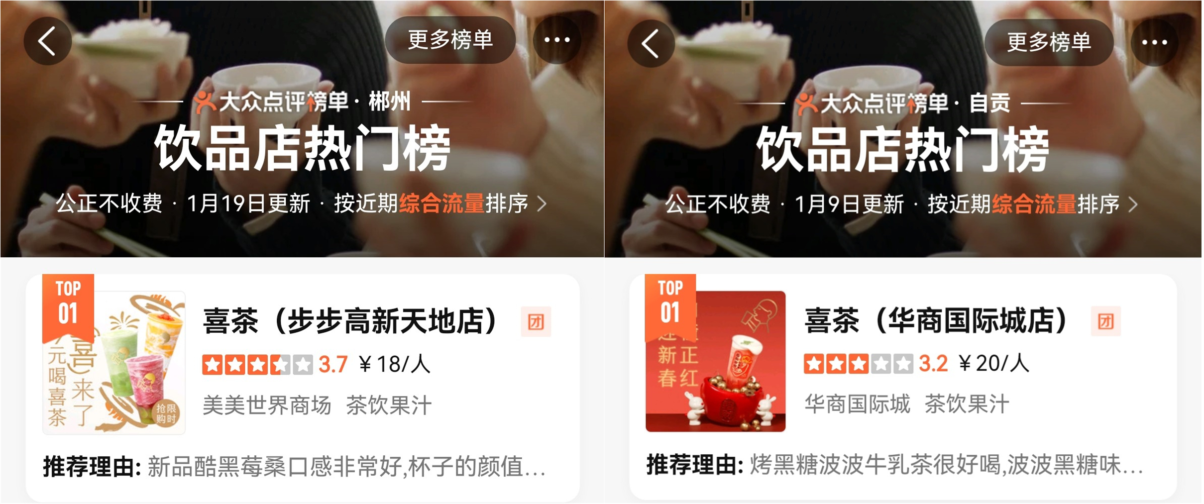 凭借火爆的人气和持续提升的口碑,包括盐城中南大有境店、自贡华商国际城店、郴州步步高新天地店等在内的大部分喜茶事业合伙门店,在开业后一周内就快速登上了各地大众点评榜单饮品热门榜第一名。“终于能在家喝到喜茶了”、“喜茶真香”……许多消费者在社交媒体上晒出了喝到喜茶的喜悦心情。