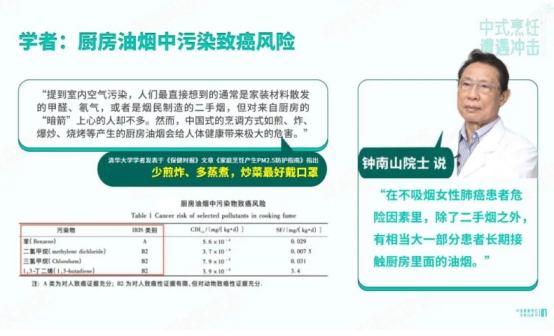 钟南山院士曾表示:“在不吸烟女性肺癌患者危险因素里,除了二手烟之外,有相当大一部分患者长期接触厨房里面的油烟。” 上海交通大学资深教授、空气净化行业专家吴吉祥也在早前提出过相似观点,即厨房油烟具有多重危害,包括诱发癌症,诱发心脑血管疾病、肺病等,需要引起重视。