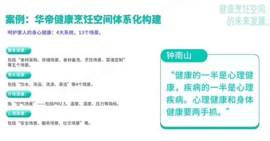 《白皮书》从中西方烹饪差异、当代厨房的“四大弊病”、中国厨房的演变趋势等不同维度出发,探讨了中式烹饪空间经历的现代化革命的八大维度,并点明了其中的核心关键词是“健康”。研究认为,真正的健康生活有以下几个指标:高效、健康、环保、享受等。重点落在功能价值和情绪价值的双重满足。这一观点,与华帝强调的“厨房不仅是烹饪场所,更是家居秀场、游乐场和心灵治愈场”非常一致。