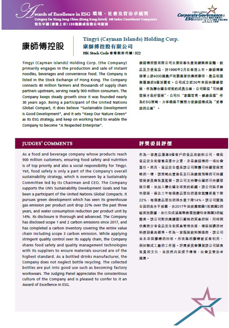 评奖委员会指出:作为一家产品覆盖9亿客户的食品和饮料公司,确保食品安全和营养是重中之重,亦是康师傅的一项社会责任。然而,食品安全仅是公司整体可持续发展策略的一环,该策略由董事会主席领导的可持续发展委员会负责监督。公司支持联合国的可持续发展目标,并加入联合国全球契约组织。公司追求绿色发展,过去三年每个产品单位的温室气体排量下降22%,每个产品单位的耗水量下降14%。公司实施全面的高水平披露,自2017年起披露范围1和范围2的碳排放数据,并已完成涵盖整条价值链的范围3的碳排查。公司对供应链实行严格的质素控制,同时与供货商分享食品安全和质素管理技术,确保采购的材料达到最高标准。作为一家瓶装饮料制造商,公司并未忽视塑料瓶的回收。所收集的塑料瓶被妥善利用,例如制成工厂的工作服。评奖委员会赞赏公司认真负责的文化,并欣然向其授予环境、社会及管治卓越奖。