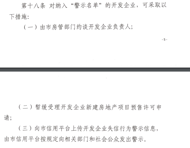 武汉中海海耀房地产有限公司得分因为低于75分,武汉中海被列入警示名单,对于纳入“警示名单”的开发企业,主管部门会约谈开发企业负责人、对开发企业新建商品房预售许可证会暂缓受理、并向市级信用平台按规定向相关部门和社会发出警示。
