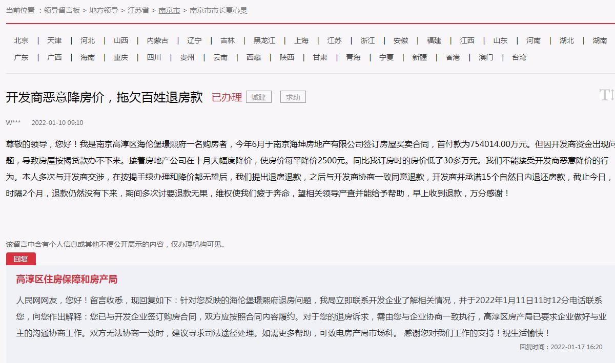 2022年1月消费者在城市留言板反映自己购买了南京高淳区海伦堡璟熙府项目。因开发商资金出现问题,导致房屋按揭贷款办不下来,后期退款遇到问题。该项目前有消费投诉退款难,现在又有消费者通过网络反映该项目又发了延期交付通知。高淳海伦堡璟和府还有璟文府的业主向《标点帮忙》记者求助:自己4月30日就该交付的房子,直到五月中旬了依然没有交付,而且开发商对待延期的托词让人难以接受,虽然公布了延期交房时间,但开发商的种种做法,让业主们怀疑,房子还有再次延期的可能!