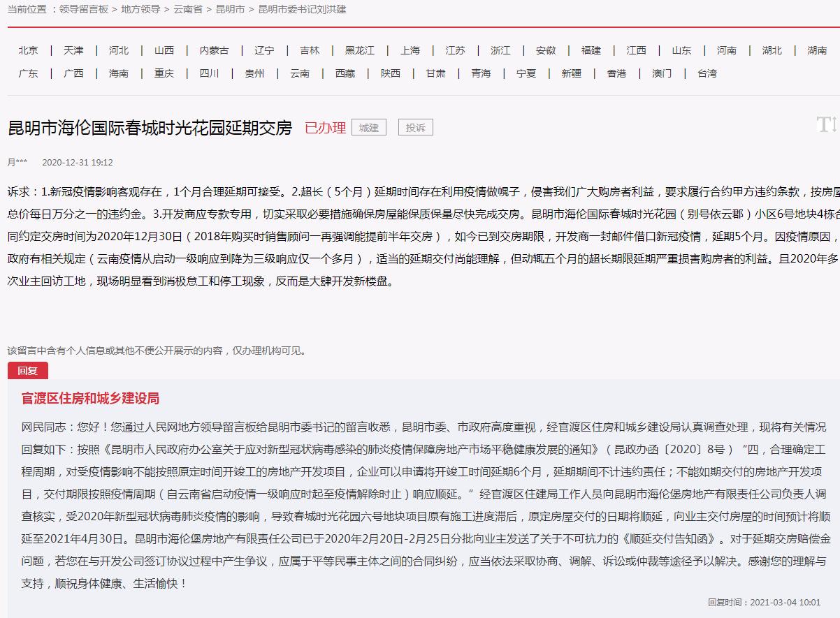 海伦堡在云南地区项目延期交付貌似成为了习惯,云南的城市留言板也有消费者多次投诉海伦堡项目延期交付问题。之前有消费者也反映昆明市海伦国际春城时光花园延期交房。海伦堡在昆明的合作项目五华区三千时光四期别名的璀璨星城,消费者在城市留言板也反映项目停工,交付有可能延期交付。在昆明的城市留言板也有消费者反映他们之前的海伦堡中央广场(A4地块)2幢房屋也存在超期交付情况,并对超期时间有疑问涉及超期交付赔偿问题。