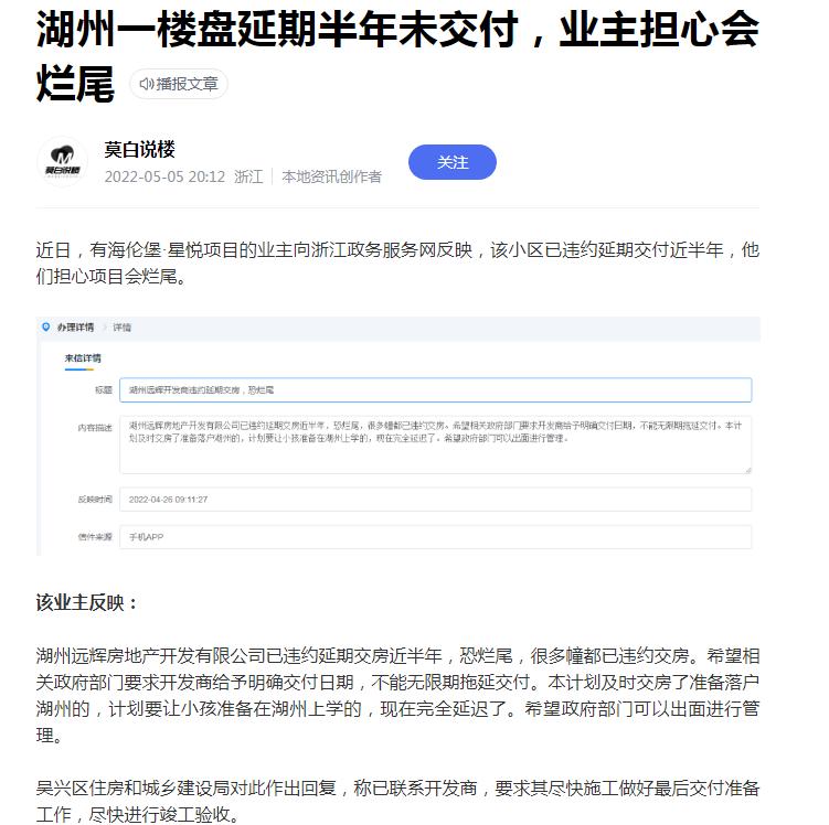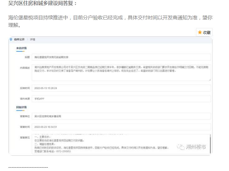 在浙江,海伦堡·星悦项目的业主向浙江政务服务网反映,该小区已违约延期交付近半年,他们担心项目会烂尾。5.24日吴兴区住房和城乡建设局答复: