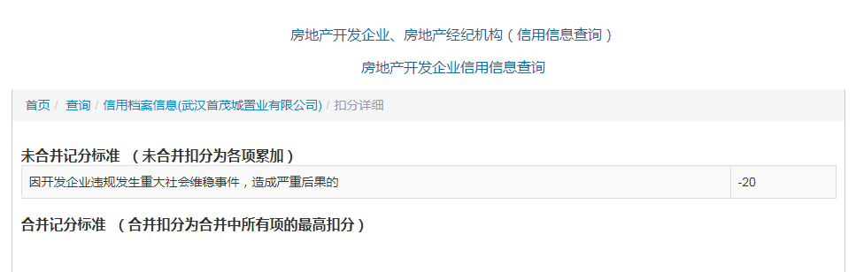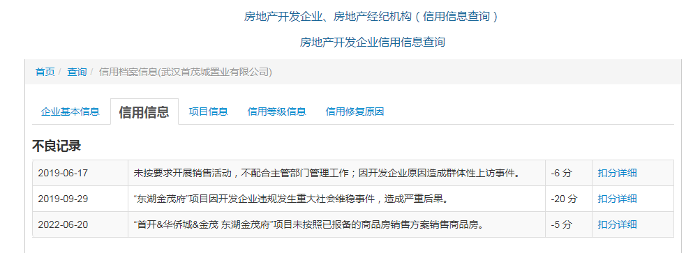 武汉首茂城置业有限公司分别有首开、金茂、华侨城三家国有企业按比例持股。在2019年因开发商原因导致群体上访事件,发生重大社会维稳事件,并造成严重后果被分别扣6分和20分信用积分。2022年“首开&华侨城&金茂 东湖金茂府”项目未按照已报备的商品房销售方案销售商品房被扣5分。从这三次扣分情况来看,武汉首茂城置业有限公司的经营行为给当地主管部门工作带来很大被动,身为三大国企合资项目,按照常理不应该出现这样的情况。不知道作为合资项目,最终的经营行为是由有那一家来说了算,还是谁说了都不算?总之这样的违规操作,不符合国有合资企业的身份,维护社会稳定也是国有企业肩负的责任,而不是成为事件的主角。
