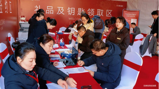交付之日,红毯鲜花自门庭延伸,一条炽热的归家大道引领家人步入崭新生活。现场流程严谨而高效,从资料审核、文件签署到钥匙的郑重交接,每一步皆有条不紊。业主身旁均有专业物业管家全程贴心陪同。验房环节经验丰富的工程师细致讲解,耐心答疑,将一站式高效交付化为实实在在的安心体验。