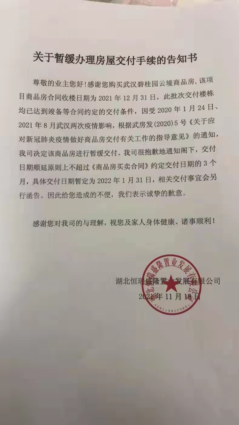 1、武汉碧桂园云境未向业主出具政府颁发的三证一书一表,一证两书。