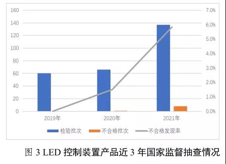 (三)LED控制装置不合格发现率为5.8%。本次抽查了10个省(市)131家企业生产的137批次LED控制装置产品,发现8批次产品不合格,不合格发现率为5.8%,较上次抽查上升了4.3个百分点。近三年该产品不合格发现率分别为0%、1.5%、5.8%。