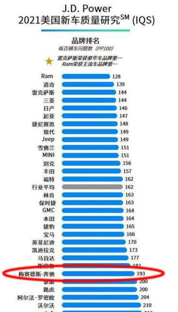 不光是在中国市场,奔驰品牌在全球的质量口碑都不算高。在 J.D. Power不久前发布的2021美国新车质量研究(IQS)中,奔驰的分数在榜单中排行接近垫底。