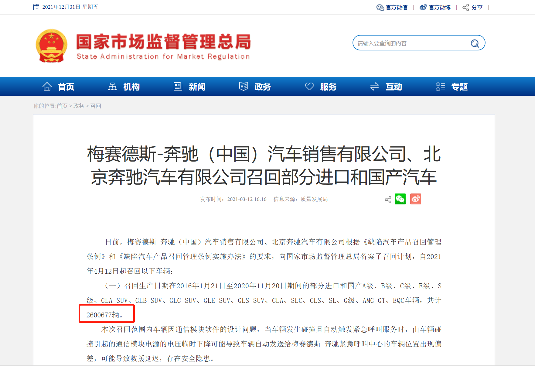 据媒体统计,截止12月中旬,今年奔驰在国内共发起了15次召回活动,共2778791辆车,不但在豪华品牌中十分罕见,甚至超过了大部分主流汽车品牌,而这其中几乎涉及奔驰全系车型。值得一提的是,今年最大规模召回活动启动在3月12日,涉及缺陷车辆高达260余万辆。要知道,奔驰去年在全球销量也不过216.4187万辆,在国内的销量也才77.4382万辆,仅今年单次召回的车辆,就超过了奔驰去年全球的销量,是去年奔驰在华销量的3倍。