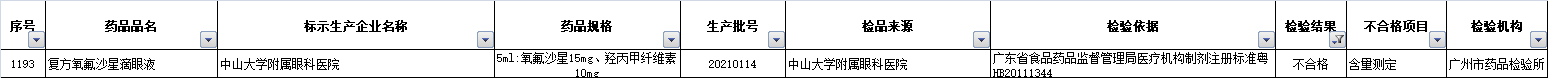 1月10日,广东省药品监督管理局发布2021年第11期药品抽查检验信息。经核查确认,2批次药品不符合药品标准规定。其中,中山大学附属眼科医院的1批次眼药水不合格。