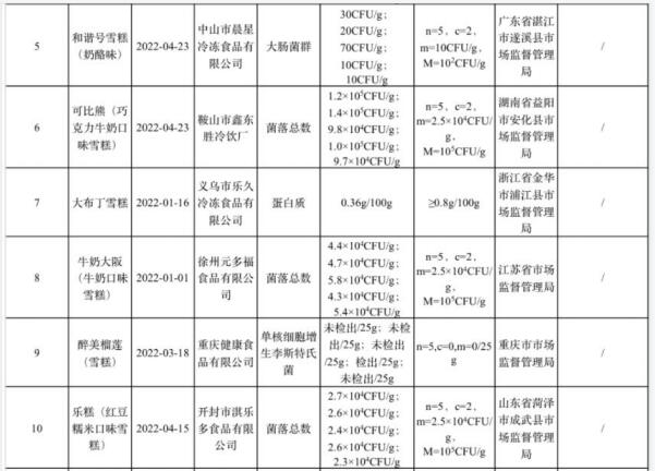 2022年上半年冷冻饮品(雪糕)不合格信息