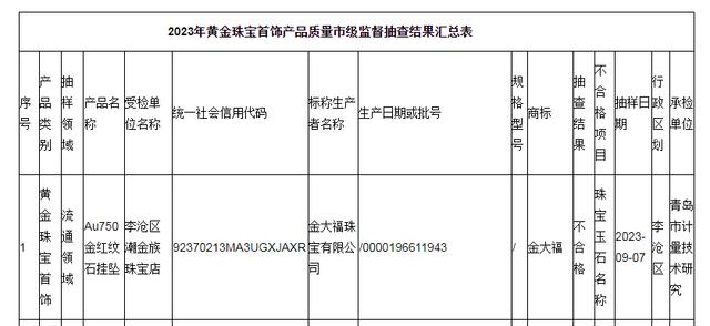 近日,青岛市市场监督管理局公布的2023年黄金珠宝首饰产品质量日常监督抽查结果的公告,标称金大福珠宝有限公司生产的一款产品不合格。