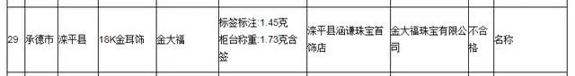 当天,河北省市场监督管理局发布的另一则产品质量监督抽查结果通告中,标称金大福珠宝有限公司生产的18K金耳饰(规格型号:标签标注:1.45克柜台称重:1.73克含签)18K金耳饰“名称”不合格、18K金耳饰“印记”以及“名称”也不合格。