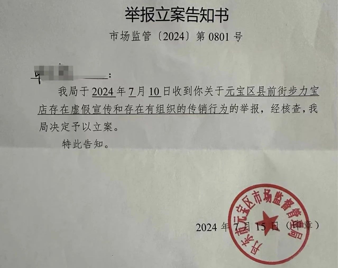 记者获悉,今年7月中旬,丹东市元宝区县前街步力宝店因涉嫌虚假宣传和涉嫌传销,已被元宝区市场监管局立案调查。