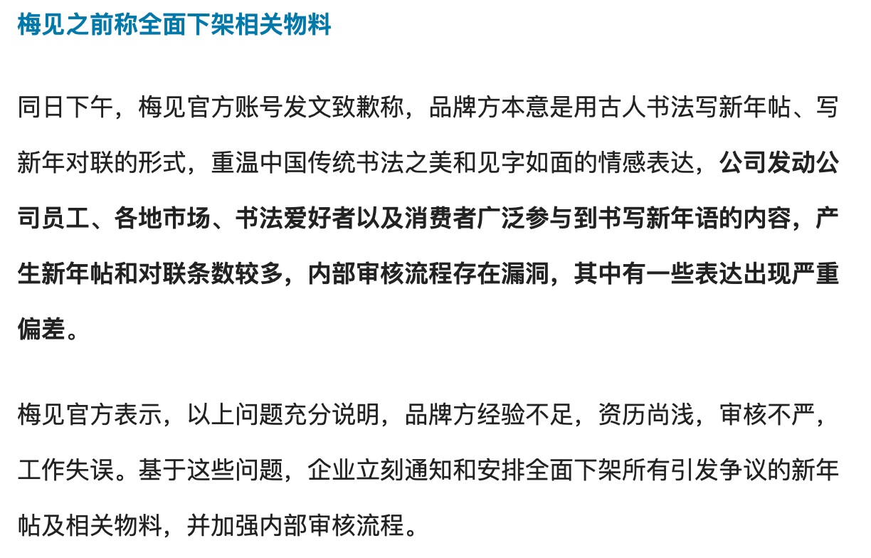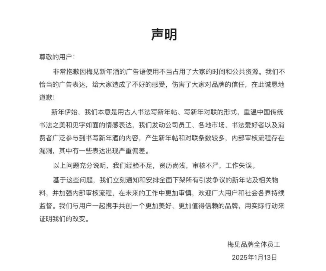 图源社交平台梅见青梅酒广告语被指不尊重女性南都湾财社记者注意到,多位网友发布的图片显示,有的梅见青梅酒卡片上写着“姐们儿,祝你新的一年兜里的钱像男人一样够花”、“郑重声明,每次妈妈说你的时候,我没有附和哦”等不同的广告语。有网友认为,涉事广告语不尊重女性。1月13日,梅见官方客服就此事向南都湾财社记者表示,已反馈情况,公司将积极反思和改善,后续也将加强监管机制和流程,避免类似情况再发生。