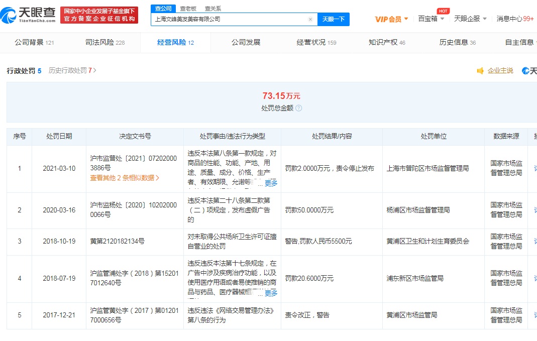 天眼查App数据显示,上海文峰美发美容有限公司曾多次被上海市场监管部门处罚。(中新经纬APP)