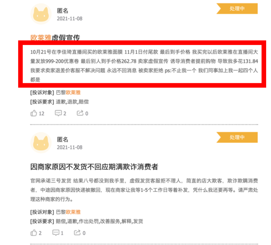 此外,还有消费者投诉称,号称“全年最大力度”的李佳琦直播间中,买20片赠送30片的欧莱雅安瓶面膜,合计50片需429元,然而11月1日-3日期间,欧莱雅发放大量满999-200的优惠券,于是有不少消费者以257元的价格在欧莱雅品牌方自己的直播间内购入了50片同款面膜。