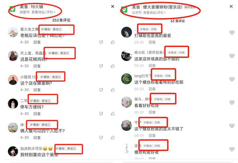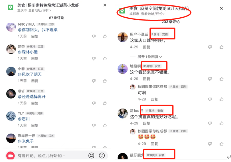 《产品可靠性报告》通过浏览各地探店视频的评论区发现了其中的端倪,“水军”的评论时间、评论内容、IP地址高度一致,且能做到随机@一名网友+自定义评论,据悉这样的评论能显得更为真实、可信度更高,如果这些探店视频的评论都是刷出来的,那么其点赞、转发、收藏的视频数据或许也不够真实。