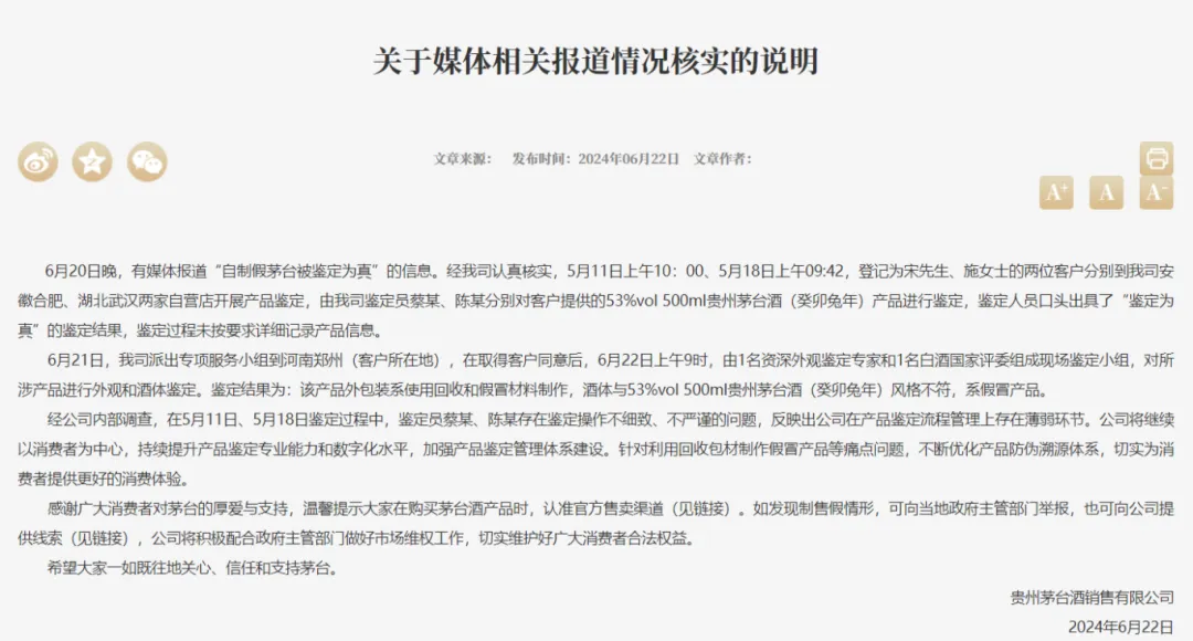 6月22日晚,茅台集团官网发布了贵州茅台酒销售有限公司说明,茅台方面称,经公司认真核实,5月11日上午10:00、5月18日上午09:42,登记为宋先生、施女士的两位客户分别到我司安徽合肥、湖北武汉两家自营店开展产品鉴定,由我司鉴定员蔡某、陈某分别对客户提供的53%vol 500ml贵州茅台酒(癸卯兔年)产品进行鉴定,鉴定人员口头出具了“鉴定为真”的鉴定结果,鉴定过程未按要求详细记录产品信息。