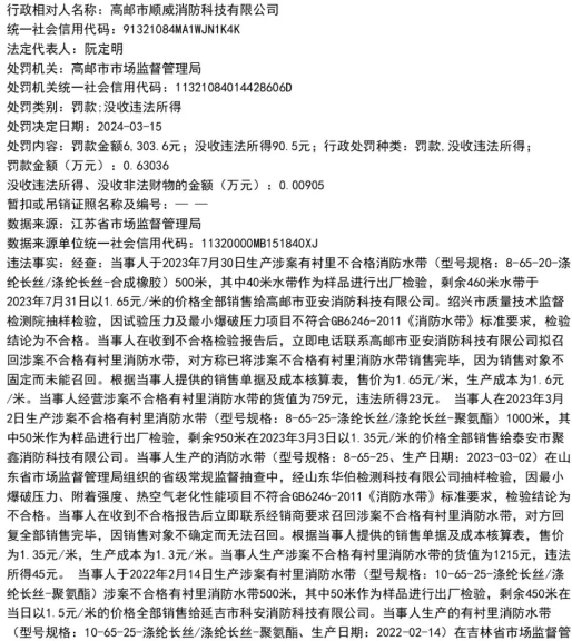 2024年6月4日,高邮市场监管局发布的处罚决定显示,顺威消防于2023年6月21日销售给项城市瑞安消防服务有限公司的水带(型号规格:8-65-25-涤纶长丝/涤纶长丝-合成橡胶)经山东腾翔产品质量检测有限公司检验,检验结论为不合格。2023年7月19日以1.4元/米的价格销售给银川市兴庆区匠心隐成消防器材部的(型号规格:8-65-25-涤纶长丝/涤纶长丝-合成橡胶)水带经山东华伯检测科技有限公司抽样检验,检验结论为不合格。