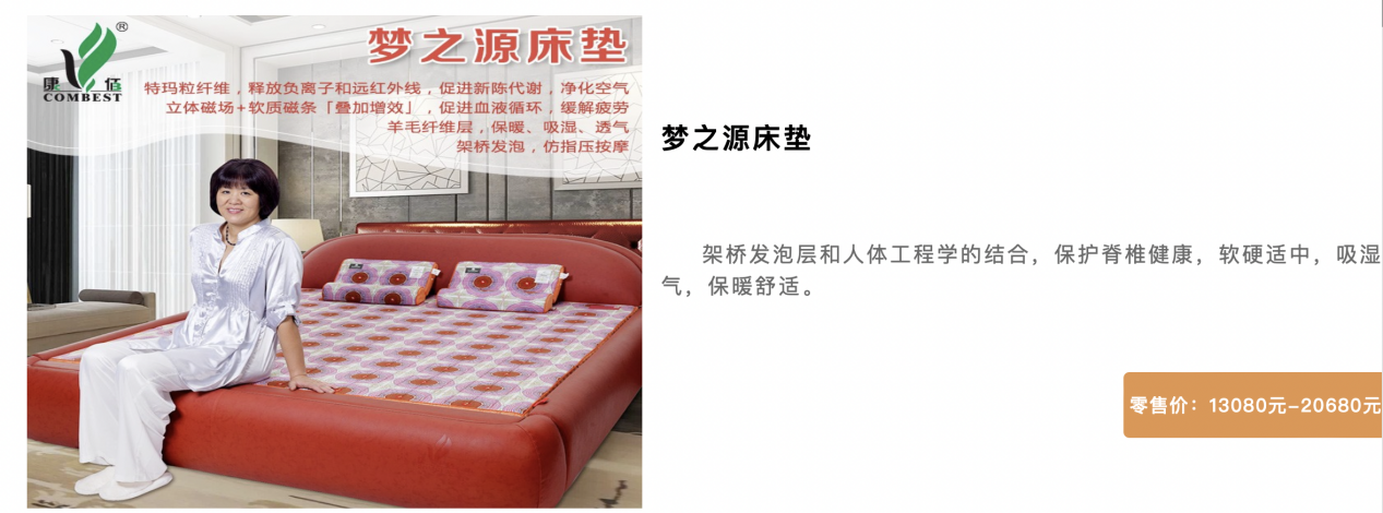 值得注意的是,在其官方网站产品中心,一款“梦之源床垫”宣传具有“特玛粒纤维促进新陈代谢、净化空气;促进血液循环、缓解疲劳”等;“全能健康床豪华版”床垫宣传具有“减轻压力、消除紧张,帮助快速睡眠”“让健康睡眠改善有据可循”功效等;“康之源健康床垫”详情页中标注“血流不畅的危害:引发头晕目眩、全身无力、高血压、冠心病、脑血栓5大问题”等内容,容易使消费者误认为床垫可以有效促进血液循环,预防和改善疾病等。