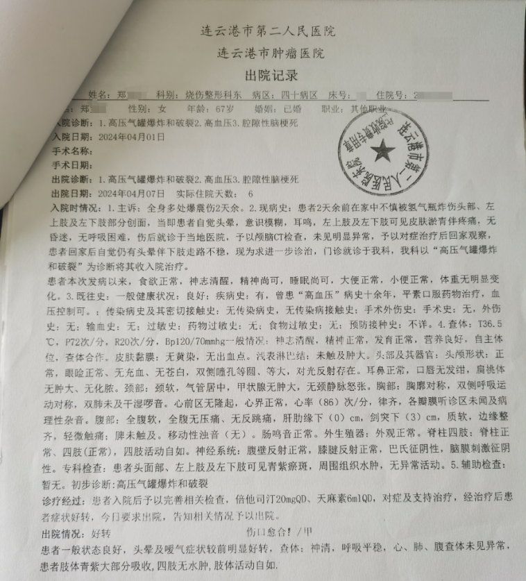 据郑女士回忆,今年3月29日晚上,她从邻居家拿了一桶20公斤的富氢水。回家后,她把水桶放在地上,因为地面不平,水桶歪倒了,就在她伸手去扶水桶时,水桶突然爆炸。剧烈的冲击波将郑女士推倒在自家的大门上,随即就出现头昏眼花、耳鸣的情况,手上都是血,手臂、腿部多处受伤。郑女士说,当时水桶被炸得粉碎,碎片飞了很远,邻居夫妻俩将她送到了医院,当时医院检查说骨头没有受伤,就回家了。在家休息两天后,郑女士还是浑身疼痛,心慌、头晕、耳鸣、想吐,无奈之下再次住院观察治疗。