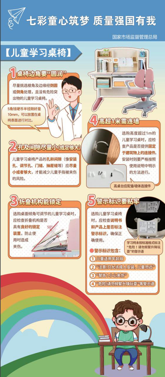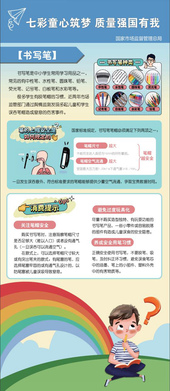 为了让质量安全走进校园,市场监管总局举行了2023年全国小学生“质量安全第一课”活动,通过宣传科普儿童和学生用品质量安全知识,教育引导少年儿童增强质量安全意识,提升质量安全素养,在活动现场展示了儿童学习桌椅、书写笔、台灯、书包、儿童家具、儿童服装等产品的消费提示。(中国经济网记者 佟明彪 苏兰)