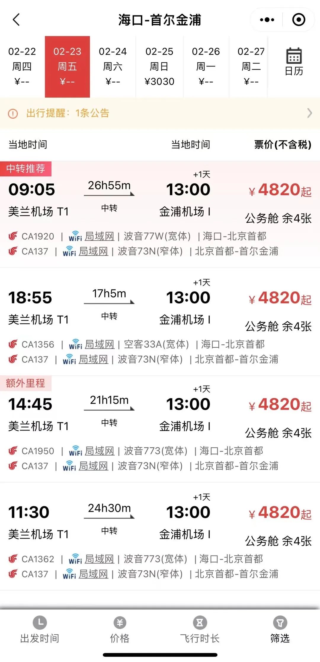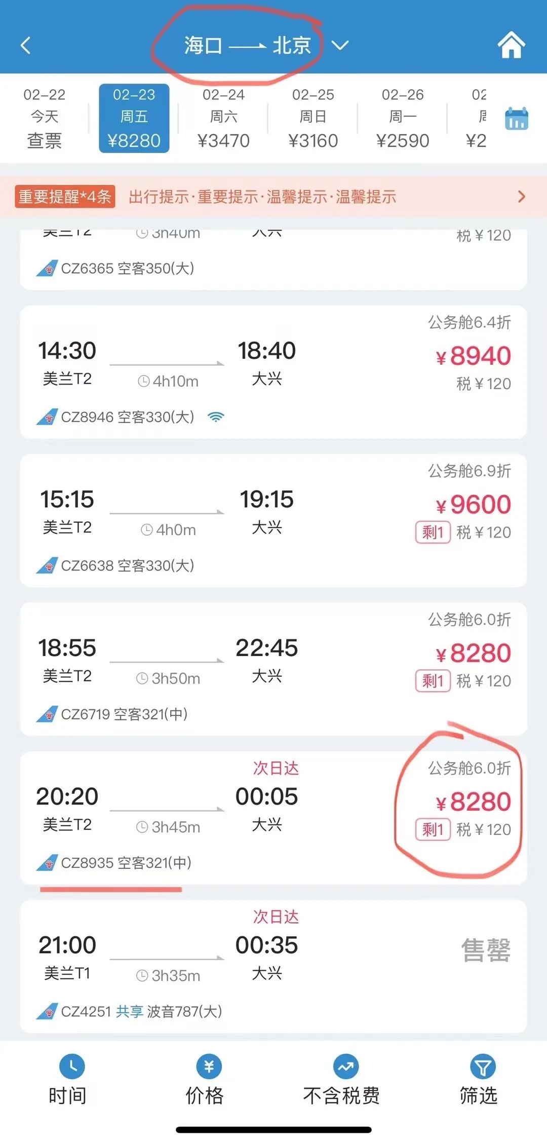 从海口抵达北京,同一航班订国际机票要比国内便宜3000元春节期间,海南旅游成为热门线路之一,但是假期过完之后,海口发往各大城市的航班一直处于紧俏状态,有细心的网友晒出订单截图,同一航班,海口飞往北京的机票价格甚至高于飞往韩国首尔的价格,有趣的是飞往首尔的航班要经北京中转。2月22日,有网友晒出订单,在南航App下单2月23日海口飞往北京,2月23日20:20的CZ8935航班,海口直飞北京,公务舱售价为8280元;选择同一航班,飞往韩国金浦机场,全程含税总价仅为7639元。该网友得出结论,如果你买海口回北京的机票,建议买海口到首尔在北京中转的机票,同一航班,价格更低。