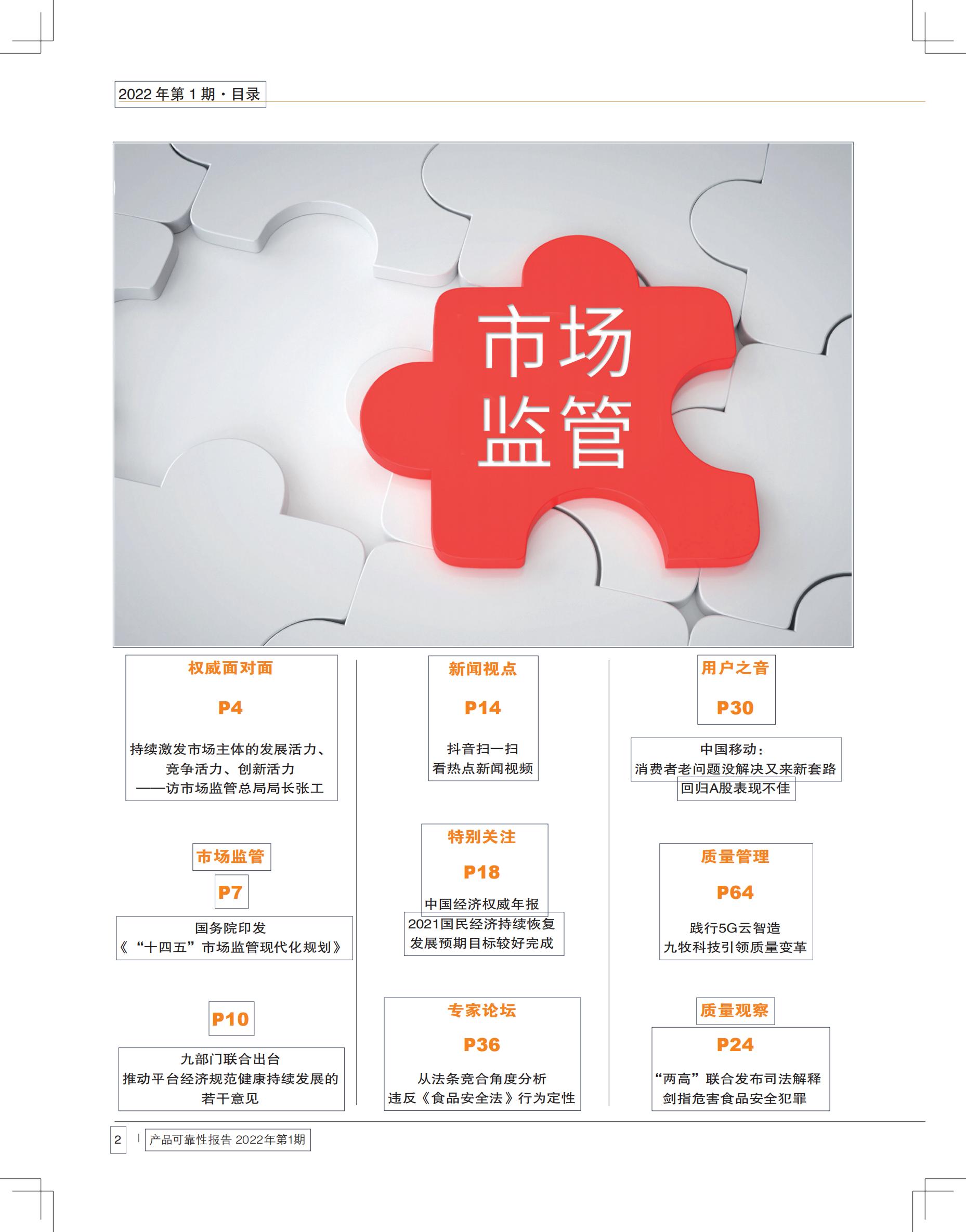 本期热点:权威面对面:访市场监管总局局长张工;国务院印发《“十四五”市场监管现代化规划》;市场监管总局等三部门严查农村假劣食品行为十大典型案例;2021年汽车召回报告;直播乱象何时能停;中国经济权威年报。