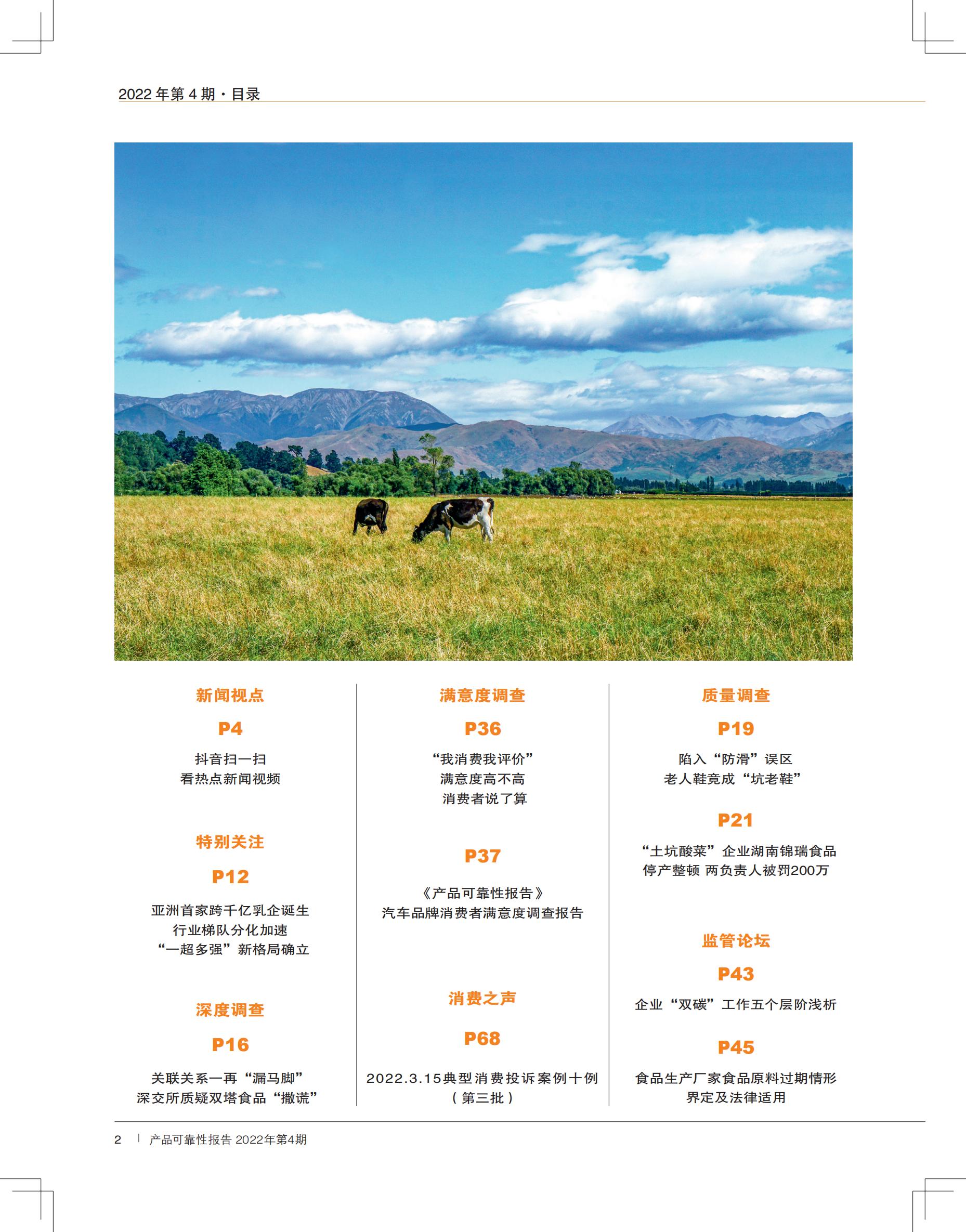 本期热点:《产品可靠性报告》汽车满意度调查报告;亚洲首家跨千亿乳企诞生;中国房地产质量安全篱笆越扎越紧;陷入防滑误区,“老人鞋”竟称“坑老鞋”;企业“双碳”工作的五个层阶浅析。