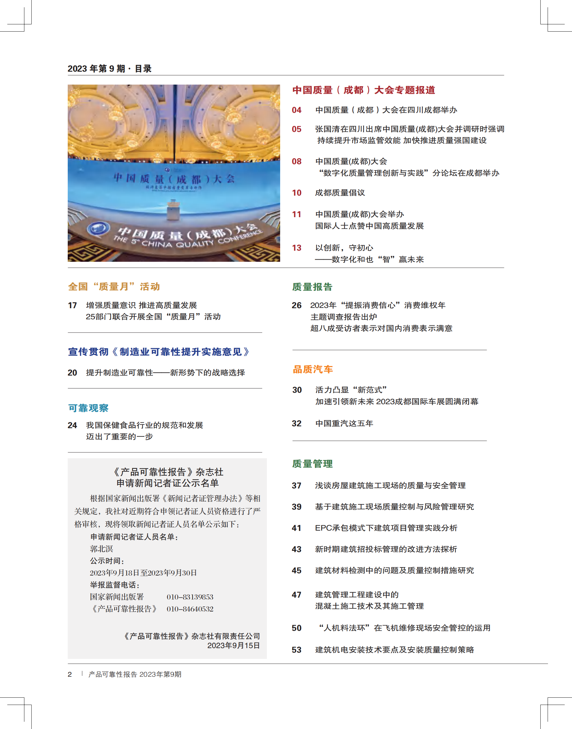 本期热点:中国质量(成都)大会在四川成都举办;中国质量(成都)大会“数字化质量管理创新与实践”分论坛在成都举办;成都质量倡议;增强质量意识 推进高质量发展,25部门联合开展全国“质量月”活动;2023年“提振消费信心”消费维权年主题调查报告出炉。