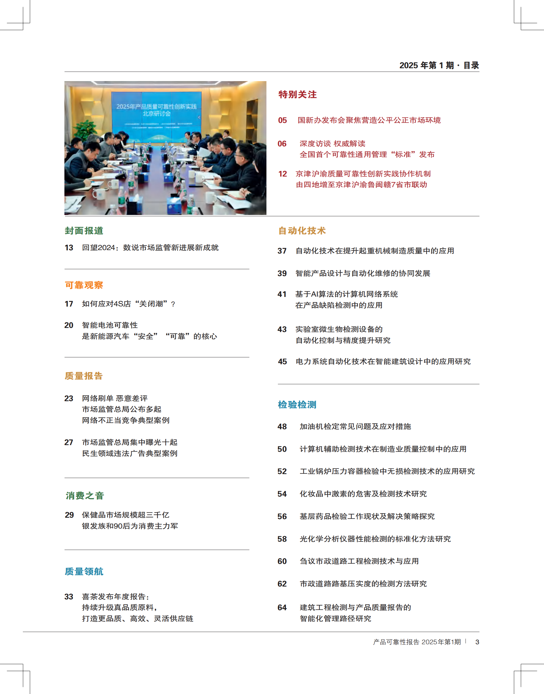 【封面报道】回望2024:数说市场监管新进展新成就;【特别关注】国新办发布会聚焦营造公平公正市场环境;【权威解读】全国首个可靠性通用管理“标准”发布 12 京津沪渝质量可靠性创新实践协作机制,由四地增至京津沪渝鲁闽赣7省市联动;【质量报告】市场监管总局公布多起网络不正当竞争典型案例;【可靠观察】智能电池可靠性是新能源汽车“安全”“可靠”的核心;【消费之音】保健品市场规模超三千亿;银发族和90后为消费主力军。