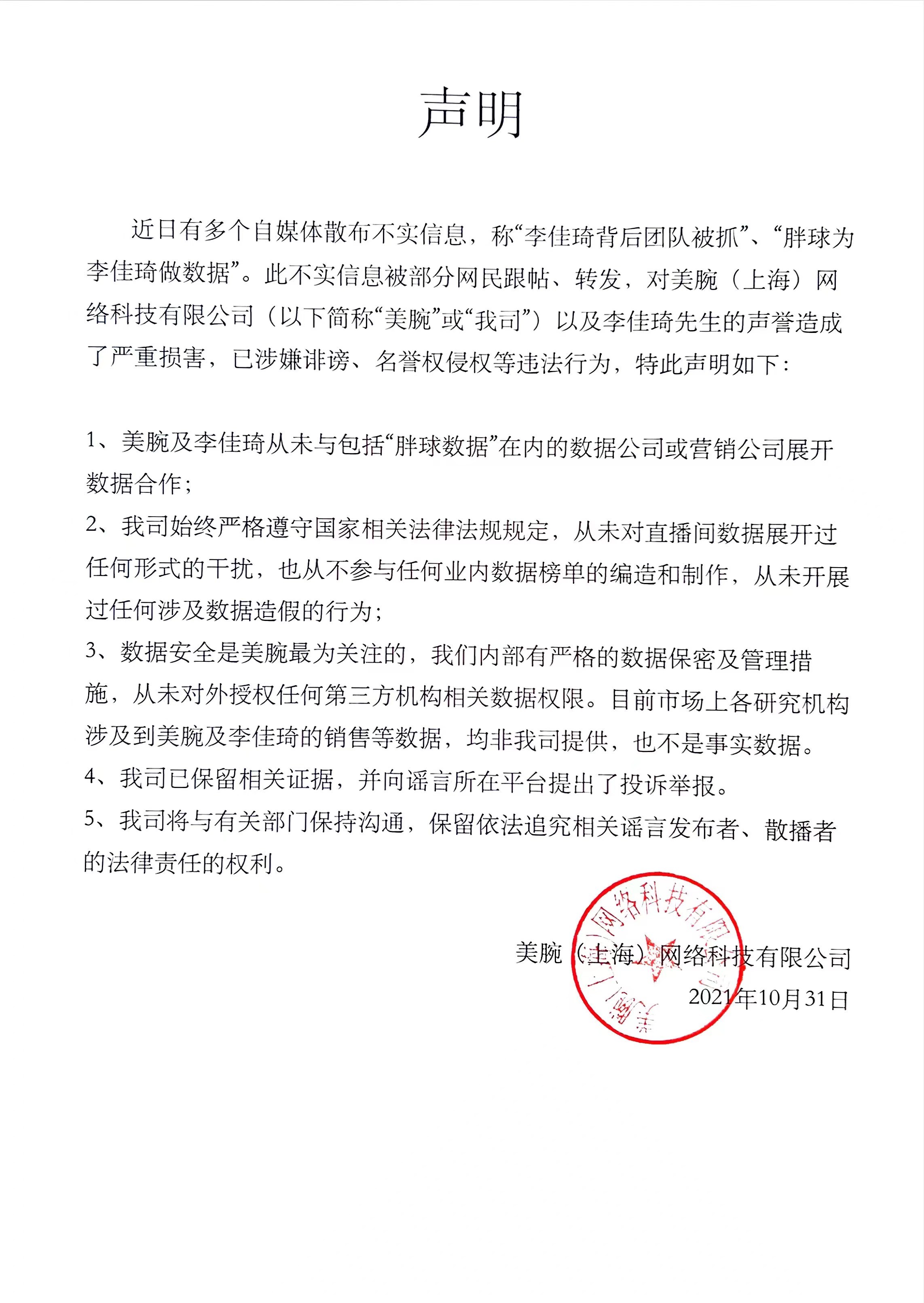声明指出,美腕及李佳琦从未与包括“胖球数据”在内的数据公司或营销公司展开数据合作;美腕始终严格遵守国家相关法律法规规定,从未对直播间数据展开过任何形式的干扰,也从不参与任何业内数据榜单的编造和制作,从未开展过任何涉及数据造假的行为;数据安全是美腕最为关注的,公司内部有严格的数据保密及管理措施,从未对外授权任何第三方机构相关数据权限。目前市场上各研究机构涉及到美腕及李佳琦的销售等数据,均非公司提供,也不是事实数据。