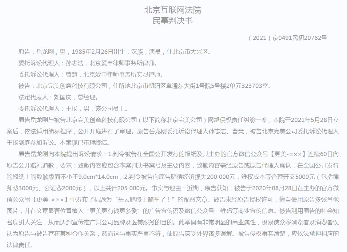 文书显示,被告北京完美公司未经授权许可,在其公众号中发布标题为《岳云鹏终于翻车了!》的文章,使用了原告大量肖像照片,并植入广告等商业宣传信息。