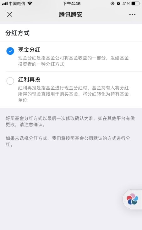 针对这些问题,中证君采访了腾讯方面。有关工作人员说,在分红选择方式界面上,现金分红一栏下面明确写着“将分红所得资金放到余额+,可灵活取出”。界面下方还有对分红方式的补充说明,提示用户修改余额+的默认产品。
