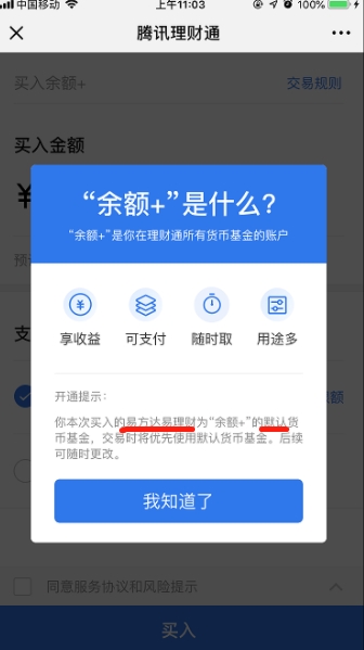 至于余额+的开通状况,上述工作人员表示,在使用理财通购买基金产品时,用户会收到开通余额+账户的提示,甚至特别提醒余额+账户开通时会直接确定默认产品(以开通时7日年化最高的货币基金作为默认),而投资人也可在余额+中更换默认货币基金。
