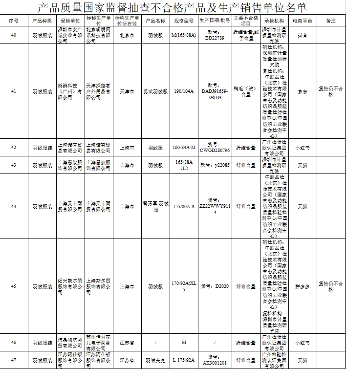 近日,市场监管总局通报羽绒服装产品质量国家监督抽查情况。