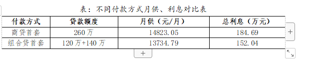 举个更为直观的例子,某职工要购买一套评估价为400万元的房屋,此前凭借商贷首套资格可以贷款260万,25年等额本息还款,月供为14823.05元/月,利息总额为184.69万。新标准施行后可以采用首套公积金组合贷款方式付款,假设公积金部分可贷120万,商贷部分贷140万,25年等额本息还款,月供为13734.79元/月,利息总额为152.04万。从纯商贷到公积金组合贷月供减少1088元,可节省总利息32.65万元,购房者还款负担和总购房成本都将有明显下降。